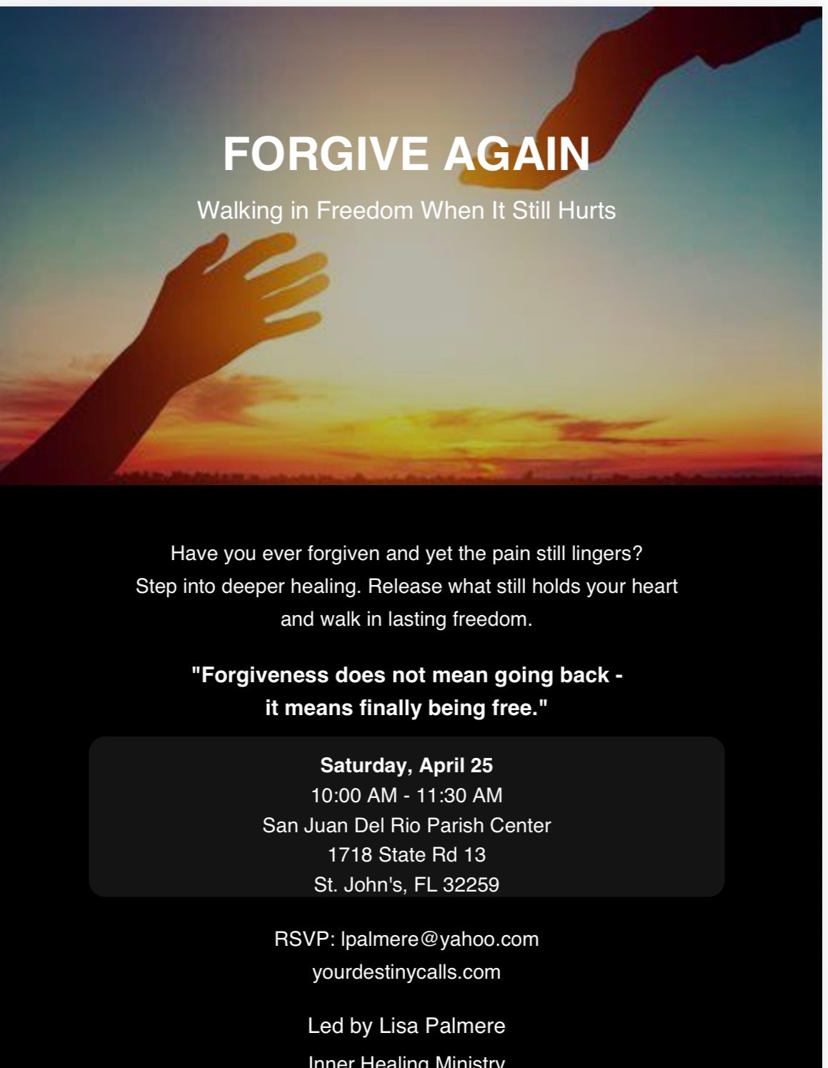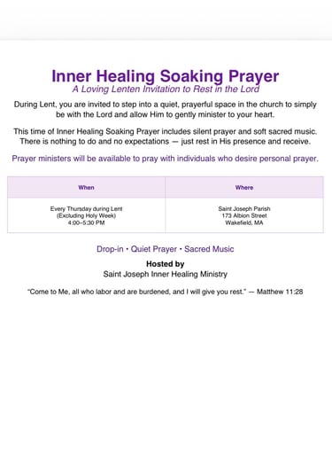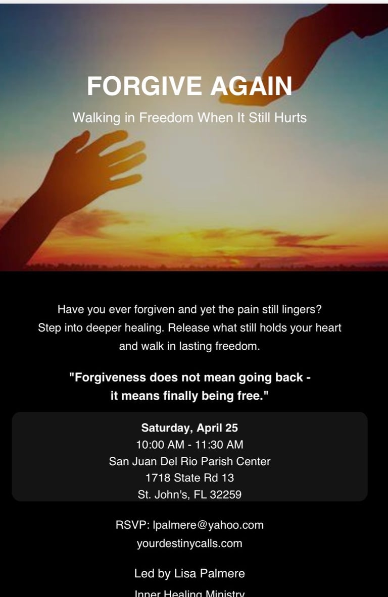 A full-day transformational retreat for those ready to go beyond surface healing into lasting freedom. Topics include shame, self-forgiveness, regret, inner vows, soul ties, spiritual open doors, bitter-root judgments, and generational influences. Through teaching, reflection, and guided prayer encounters, participants are equipped to live in the freedom Christ has won.